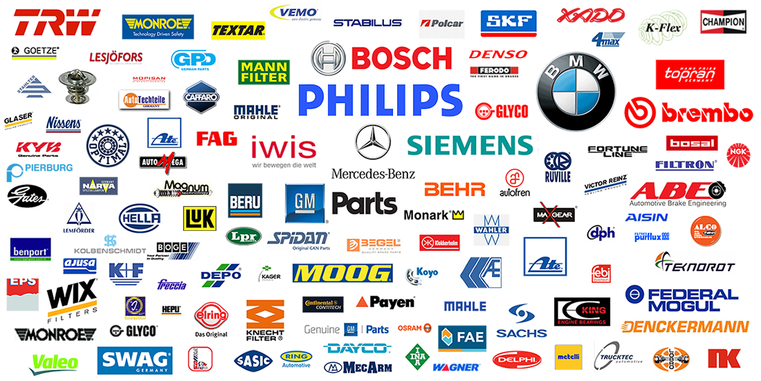 Gates, Dayco, Brembo, Ferodo, Standard, SMP, Wabco, Lemforder, Timken, Sachs, Boge, Siemens, Bosch, Philips, Osram, NGK, NK, Champion, Ate, Lucas, Hella, Varta, Bendix, AKG, Knecht, Mahle, TRW, Elring, Mann, ZF, Stabilus, Pilkington, Securit, Kolbenschidt, Ernst, K&F, Arnott, Carlson, K&N, Bilstein, Valeo, ACDelco, Denso, Fram, Sylvania